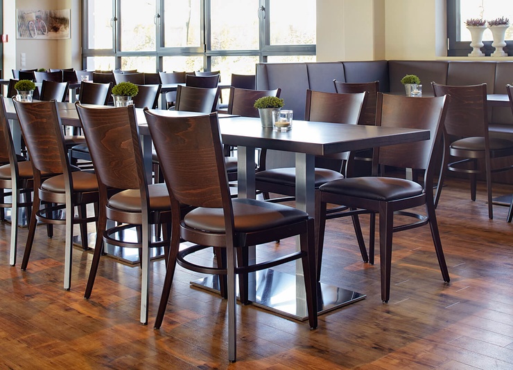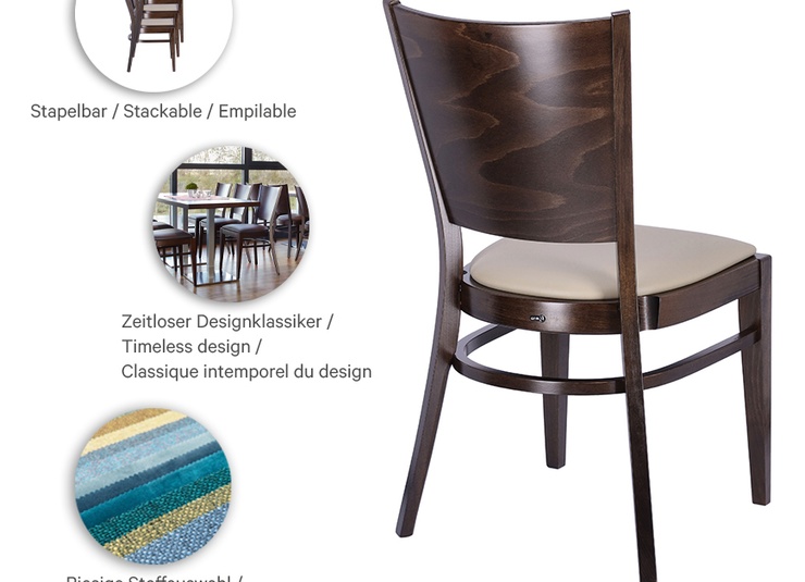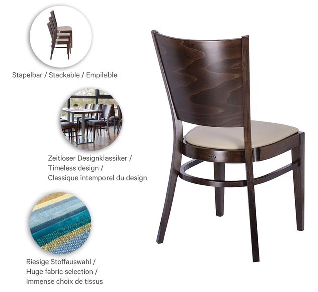 Der stapelbare Stuhl Quentin ist auch bei längerer Verweildauer die richtige Wahl, denn sein hoher Rücken ermöglicht entspanntes Zurücklehnen. Das Gestell ist aus massivem Buchenholz, die Rückenlehne aus Formholz gearbeitet. Quentin ist in den Farben Nussbaum oder Schwarz und mit optionalem Sitzpolster erhältlich.Artikelnummer