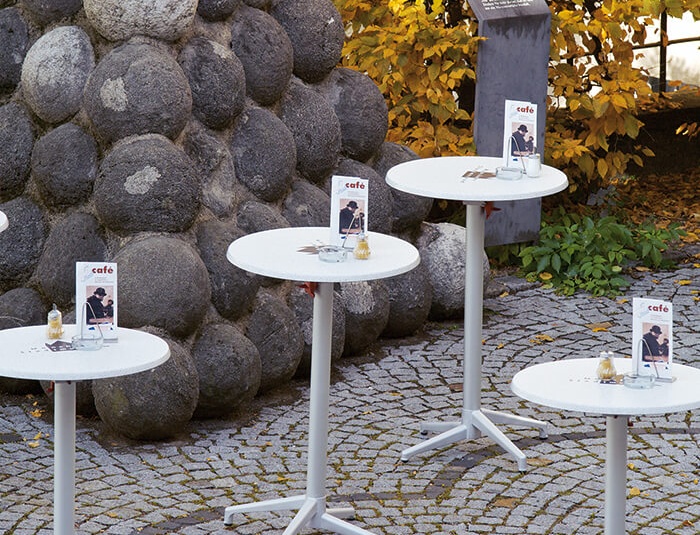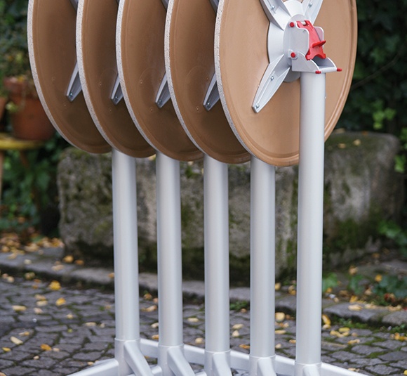 Vielseitig einsetzbar und praktisch im Handling ist der seitenstapelbare Tisch Sven. Das Gestell aus pulverbeschichtetem Aluminium ist mit verschiedenen Tischplatten kombinierbar. Durch den Kippmechanismus lassen sich die Tische platzsparend seitlich stapeln.Artikelnummer